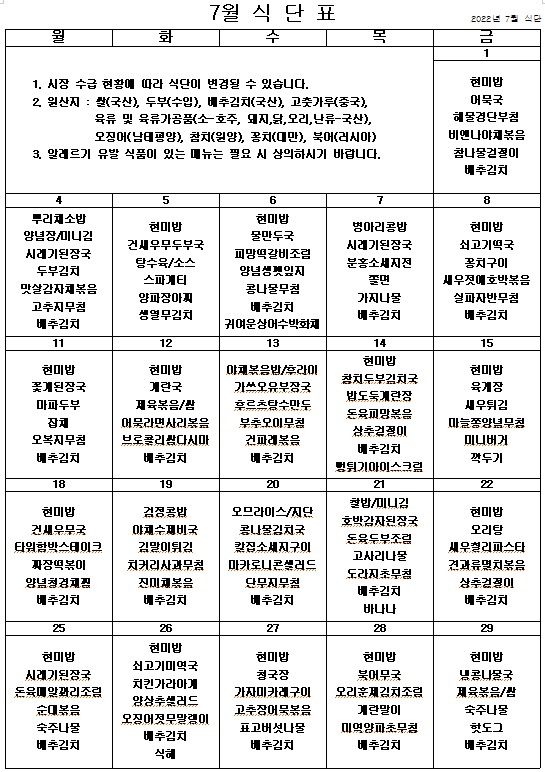 2022년 7월 식단표 ^^ 페이지 정보 작성자 관리자 작성일22-07-14 09:28 조회4,170회 댓글0건 이전글 다음글 목록 본문 무더운 여름이지만 식중독 발생에 주의하면서 맛있고 안전한 식단을 제공하도록 노력하겠습니다. 이전글 다음글 목록