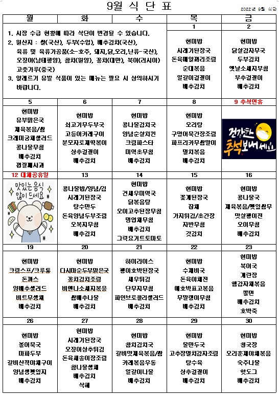 2022년 9월 식단표 ^^ 페이지 정보 작성자 관리자 작성일22-08-30 18:35 조회4,162회 댓글0건 이전글 다음글 목록 본문 보름달처럼 둥근 마음으로 풍성한 식단을 준비했습니다. 맛있게 먹고 모두의 건강을 지킬 수 있도록 열심히 노력하겠습니다. ^^ 이전글 다음글 목록