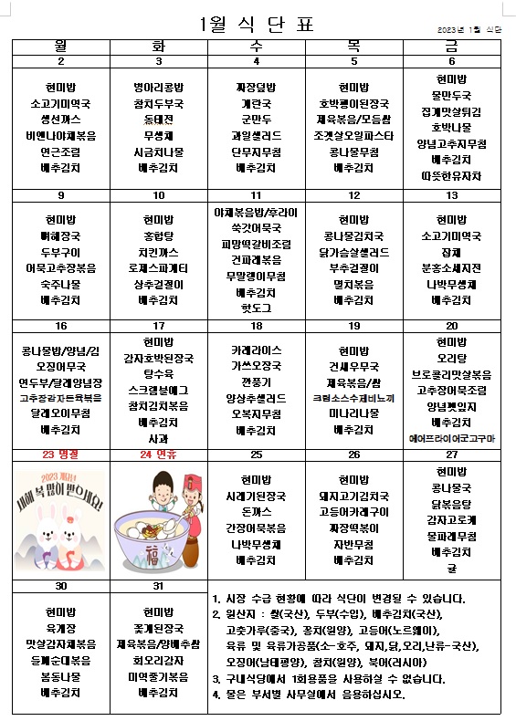 2023년 1월 식단표 ^^ 페이지 정보 작성자 관리자 작성일22-12-30 11:06 조회4,031회 댓글0건 이전글 다음글 목록 본문 내년에도 힘차게 달려봅시다! 이전글 다음글 목록