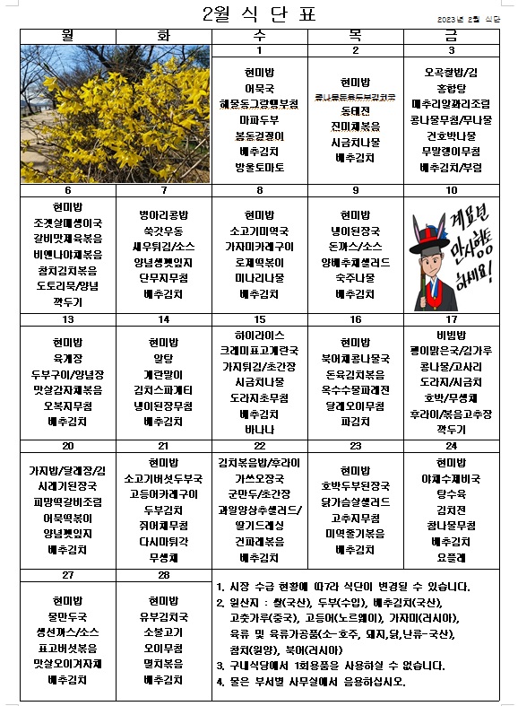 2023년 2월 식단표 ^^ 페이지 정보 작성자 관리자 작성일23-01-31 09:18 조회4,220회 댓글0건 이전글 다음글 목록 본문 2월에도 더욱 맛있는 음식을 준비하겠습니다. ^^ 이전글 다음글 목록