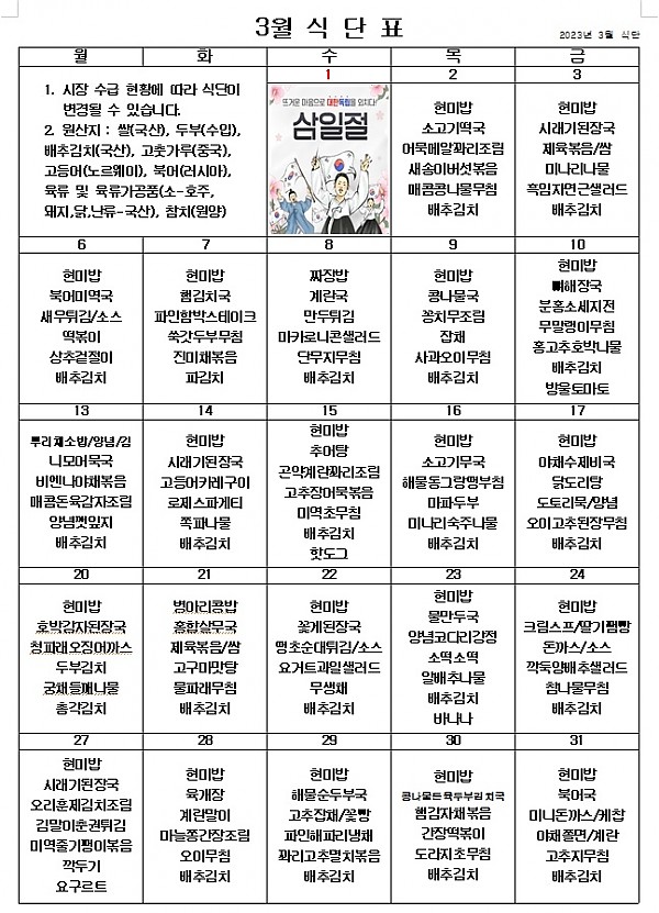 2023년 3월 식단표 ^^ 페이지 정보 작성자 관리자 작성일23-02-28 15:14 조회4,232회 댓글0건 이전글 다음글 목록 본문 3월에도 맛있게 먹고 열심히 달려보아요! ^^ 이전글 다음글 목록