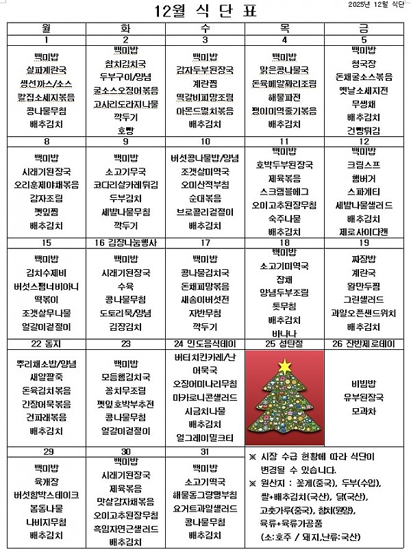 2025년 12월 식단표 ^^ 페이지 정보 작성자 관리자 작성일25-11-27 21:11 조회704회 댓글0건 이전글 다음글 목록 본문 12월에도 맛있게 먹고 건강한 마음으로 열심히 일해보겠습니다. ^^ 이전글 다음글 목록