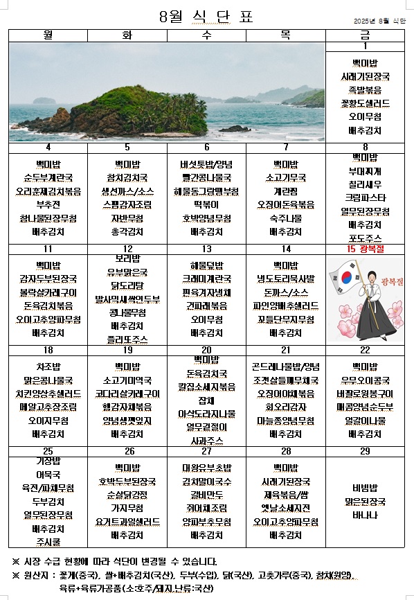 2025년 8월 식단표 ^^ 페이지 정보 작성자 관리자 작성일25-07-31 10:58 조회1,063회 댓글0건 이전글 다음글 목록 본문 더워도 너무 더운 여름이지만 건강한 음식을 맛있게 먹고 힘내서 8월에도 열심히 일하겠습니다! ^^ 이전글 다음글 목록