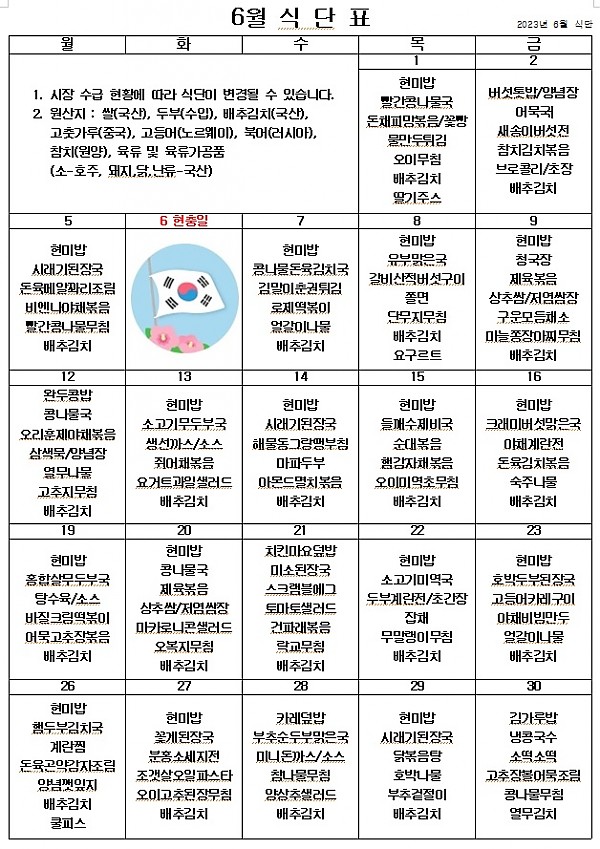 2023년 6월 식단표 ^^ 페이지 정보 작성자 관리자 작성일23-06-05 14:21 조회4,104회 댓글0건 이전글 다음글 목록 본문 무더운 여름이 찾아왔습니다. 덥지만 맛있게 먹고 힘내서 싱그러운 6월을 잘 보내겠습니다. ^^ 이전글 다음글 목록