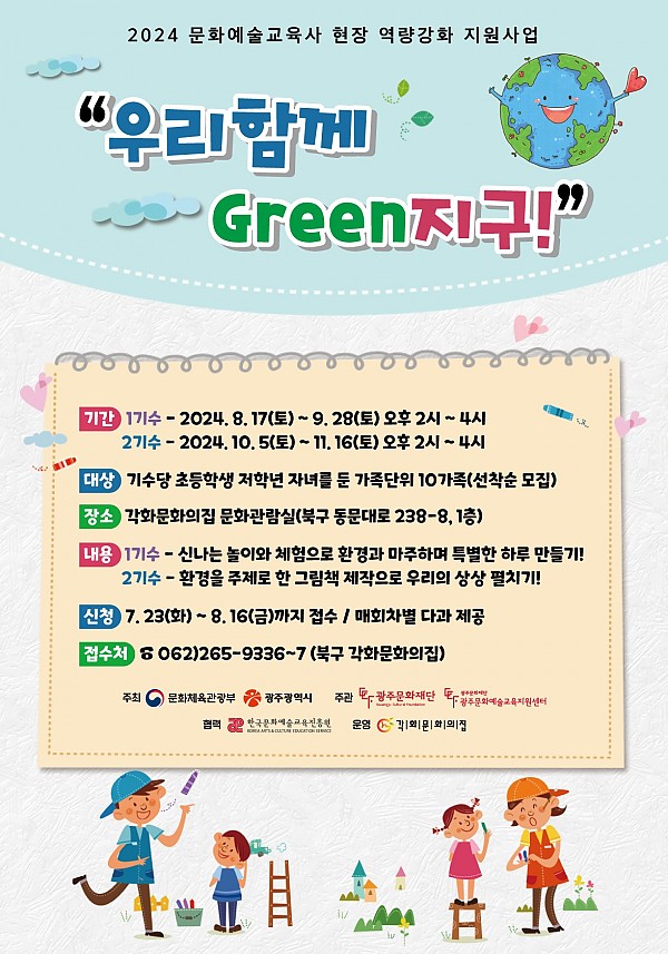 각화문화의집 '우리함께 Green지구!' 프로그램 참여자 모집 페이지 정보 작성자 정관용 작성일24-08-01 17:58 조회4,484회 댓글0건 이전글 다음글 목록 본문 '우리함께 Green지구!' 프로그램 참여자 모집 많은 참여 바랍니다! 이전글 다음글 목록