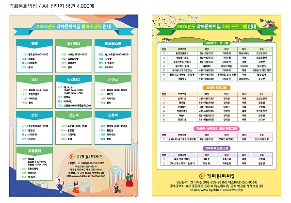 2024 동아리강좌 및 프로그램 안내 페이지 정보 작성자 정관용 작성일24-01-09 13:02 조회3,578회 댓글0건 다음글 목록 본문 각화문화의집 24년도 동아리강좌 및 프로그램 안내 올립니다.. 참고하시고 모든 분들 새해 복 많이 받으시길 바라겠습니다~~ 다음글 목록
