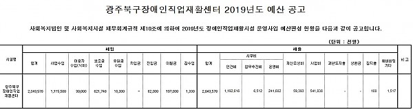 2019년 광주북구장애인직업재활센터 세입세출(예산) 공고