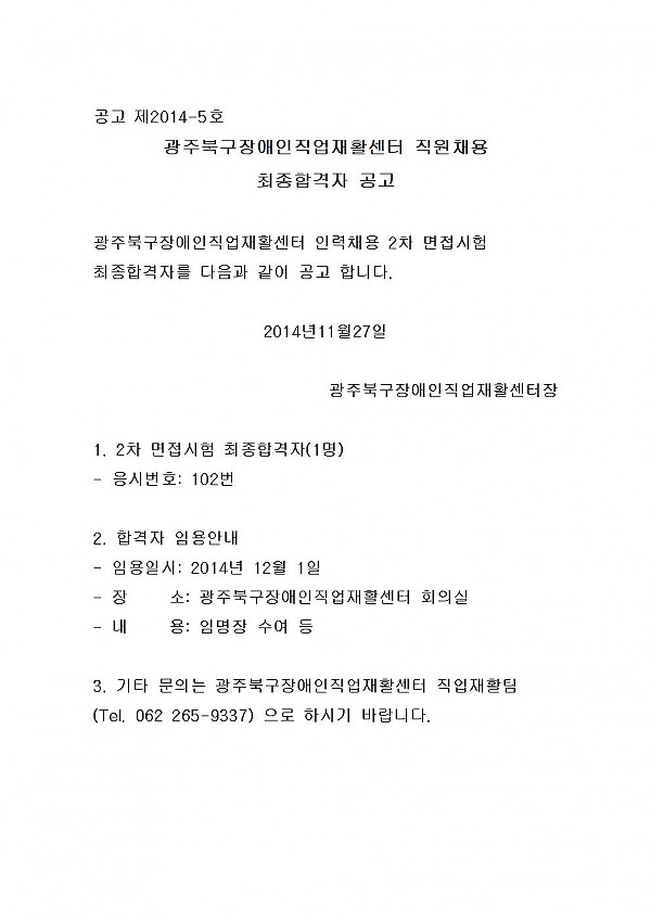광주북구장애인직업재활센터 직원채용 최종합격자 공고 페이지 정보 작성자 배지연 작성일14-11-27 08:57 조회15,003회 댓글0건 이전글 다음글 목록 본문 광주북구장애인직업재활센터 직원 채용에 관심 가져 주신 모든분들께 감사드립니다. 이전글 다음글 목록