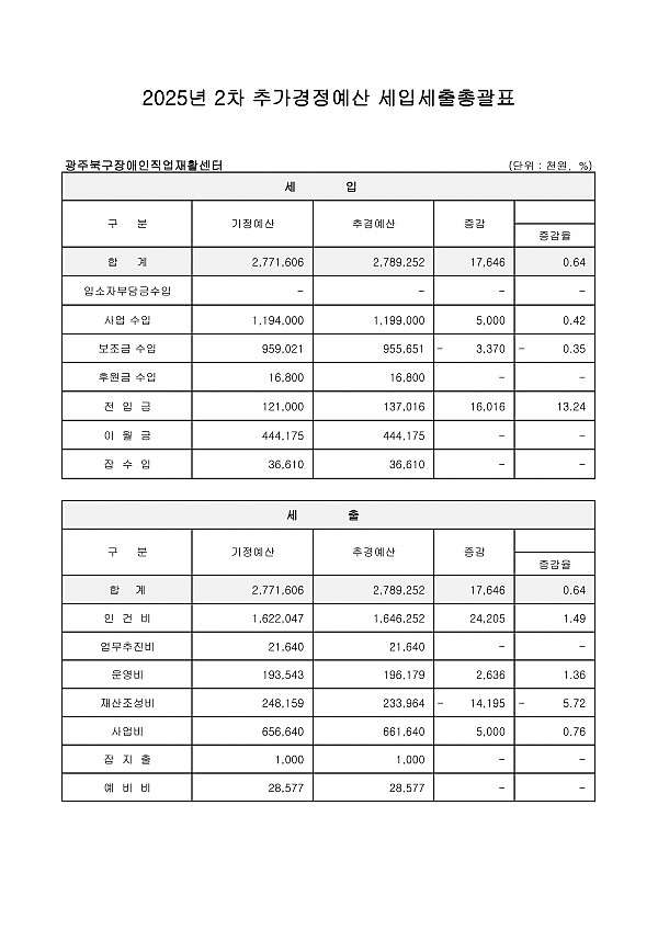2. 공고사항 : 2025년 광주북구장애인직업재활센터 2차 추가경정 세입·세출 예산서
