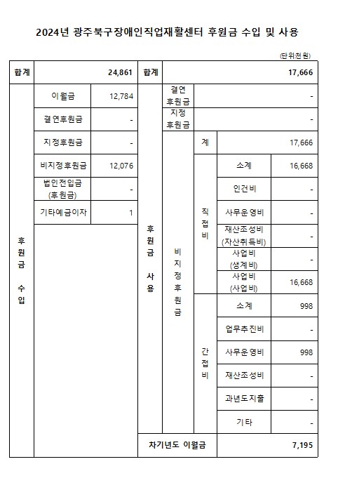2024년 광주북구장애인직업재활센터 후원금 수입 및 사용내역 공고 페이지 정보 작성자 관리자 작성일25-03-11 16:06 조회8,651회 댓글0건 이전글 다음글 목록 본문 사회복지법인 및 사회복지시설 재무․회계규칙 제41조의 6의 규정에 의거하여 2024년 광주북구장애인직업재활센터 후원금 수입 및 사용 내역을 다음과 같이 공개합니다. 이전글 다음글 목록