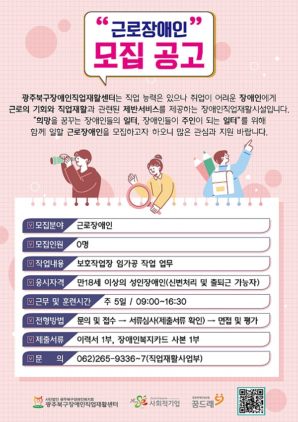 근로장애인 모집 공고 페이지 정보 작성자 관리자 작성일24-05-03 15:33 조회13,505회 댓글0건 이전글 다음글 목록 본문 *미싱 작업 가능자 우대* 광주북구장애인직업재활센터에서 함께 일할 근로장애인을 모집합니다. 많은 관심과 참여 부탁드립니다. 이전글 다음글 목록