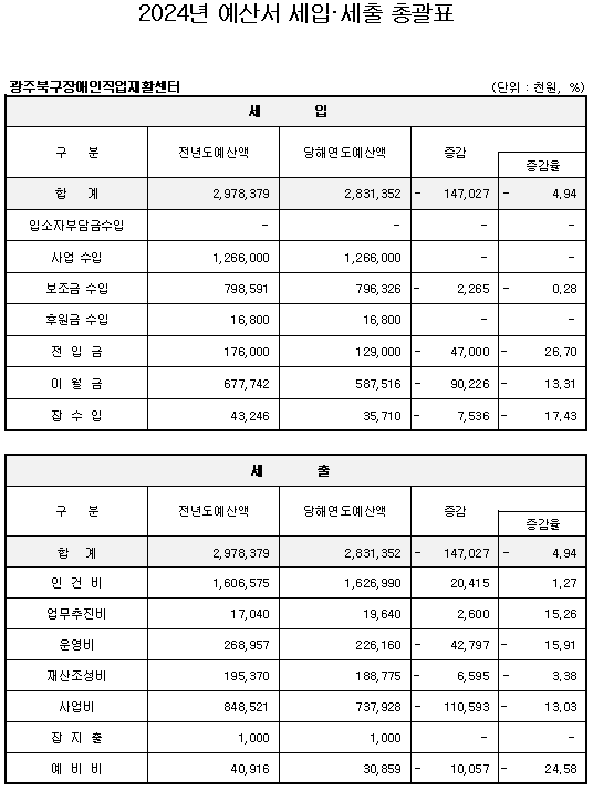 2. 공고사항 : 2024 광주북구장애인직업재활센터 세입·세출 예산서