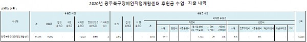2020 광주북구장애인직업재활센터 후원금 수입 및 사용내역 페이지 정보 작성자 관리자 작성일21-03-24 14:07 조회13,297회 댓글0건 이전글 다음글 목록 본문 사회복지법인 및 사회복지시설 재무․회계규칙 제41조의 6의 규정에 의거하여 2020 광주북구장애인직업재활센터 후원금 수입 및 사용 내역을 다음과 같이 공개합니다. 이전글 다음글 목록