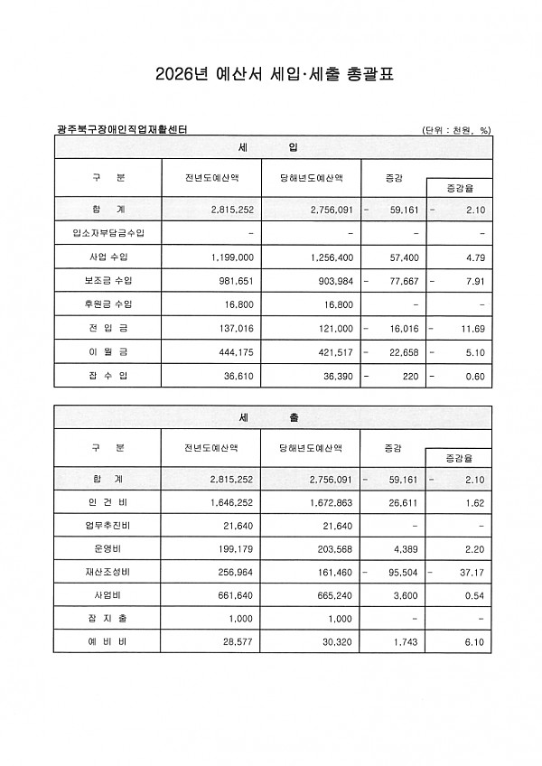 2. 공고사항 : 2026 광주북구장애인직업재활센터 세입·세출 예산서