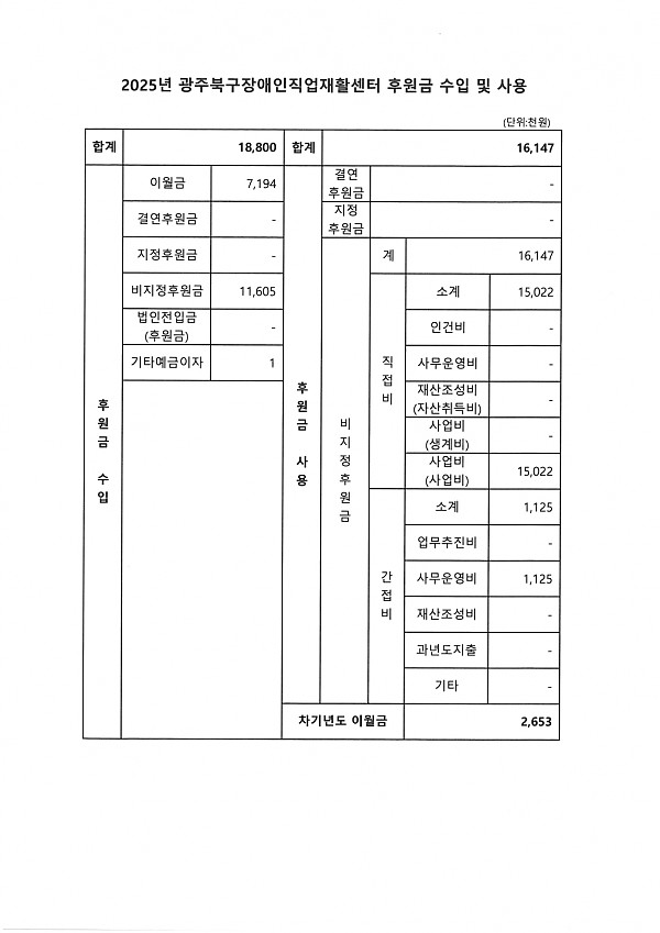 2025년 광주북구장애인직업재활센터 후원금 수입 및 사용내역 공고 페이지 정보 작성자 관리자 작성일26-03-04 17:01 조회114회 댓글0건 이전글 다음글 목록 본문 사회복지법인 및 사회복지시설 재무․회계규칙 제41조의 6의 규정에 의거하여 2025년 광주북구장애인직업재활센터 후원금 수입 및 사용 내역을 다음과 같이 공개합니다. 이전글 다음글 목록